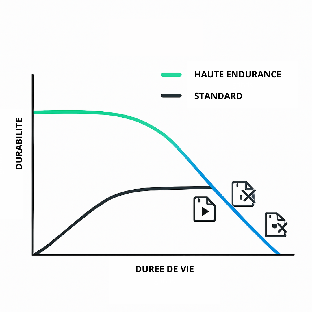 es cartes SD classiques ne supportent pas l'écriture 24/7. Notre carte SD garantit jusqu'à 40 000 heures de fonctionnement. Vos preuves vidéo cruciales resteront intactes et accessibles, même après des années d'utilisation intensive.