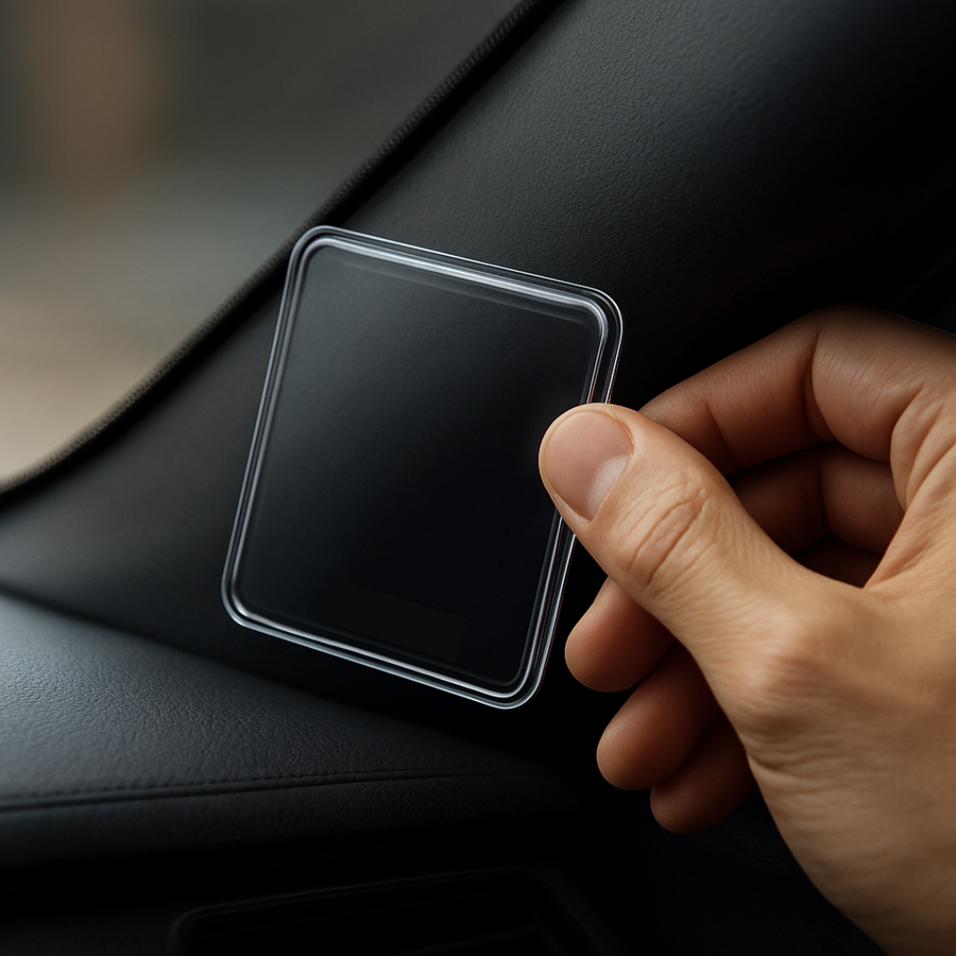 Contrairement aux supports bas de gamme qui jaunissent ou se décollent avec la chaleur derrière la vitre, le porte-carte Rinoka utilise un adhésif technique résistant aux UV et aux variations de température. Il reste cristallin et solidaire du pare-brise sans jamais laisser de résidus collants le jour où vous devez le remplacer.