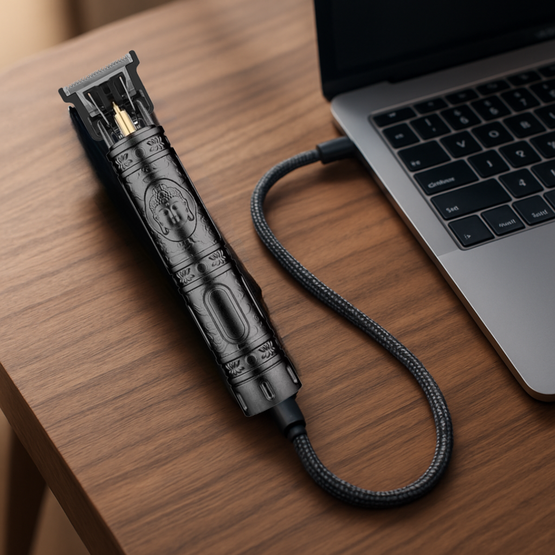 Plus qu'un simple outil, cette tondeuse est un objet de collection. Son corps ciselé aux motifs baroques modernes et sa finition bi-ton Noir et Or apportent une touche de luxe immédiate à votre salle de bain ou votre espace de soin. Elle incarne l'élégance brute de l'homme Rinoka