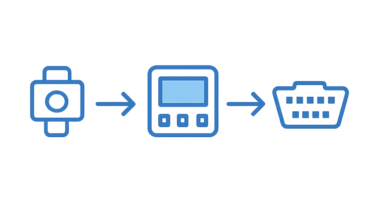 Brancher le lecteur : Moteur éteint, branchez le câble. Le lecteur s'allume automatiquement et est prêt à communiquer avec le calculateur.